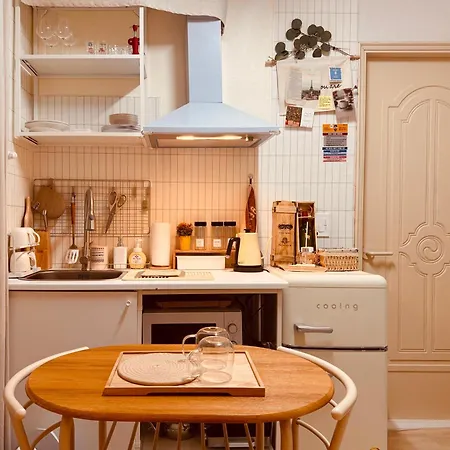 Among the self-catering amenities provided is an equipped kitchenette with an electric kettle, a refrigerator, and kitchenware. Dunchon-dong tube station is in proximity to the 23 m² apartment.